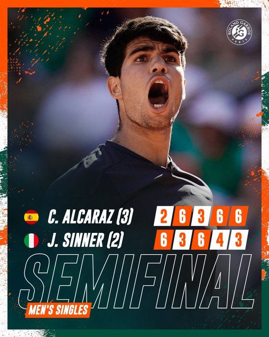 Τι κι αν βρέθηκε πίσω με 2-1 στα σετ ο Κάρλος Αλκαράθ πραγματοποίησε μία μεγάλη ανατροπή κόντρα στον Γιανίκ Σίνερ με σκορ 2-6, 6-3, 3-6, 6-3, 6-3 και σφράγισε το πρώτο εισιτήριο για τον τελικό του Roland Garros. Ο αντίπαλος του νεαρού Ισπανού θα προκύψει από τον δεύτερο ημιτελικό, όπου αναμετριόνται οι Αλεξάντερ Ζβέρεφ και Άλεξ Ντε Μινόρ.
