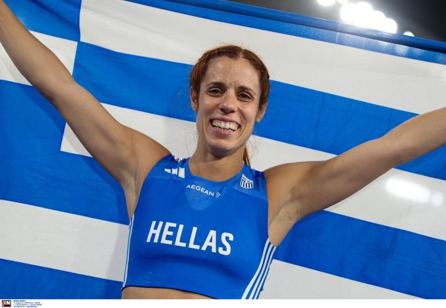 Η Ελληνίδα πρωταθλήτρια πανηγύρισε, κρατώντας την ελληνική σημαία.