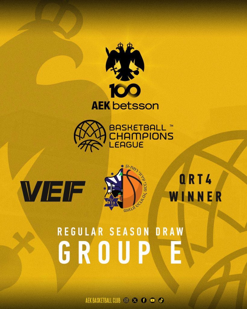 Πραγματοποιήθηκε στην Ελβετία σήμερα Τετάρτη (26/06) η κλήρωση για τη φάση των ομίλων του Basketball Champions League της νέας σεζόν (2024-25). Η ΑΕΚ ήταν στο γκρουπ των ισχυρών (Pot 1) και θα παίξει στο Group E, όπου αντίπαλοι θα είναι οι VEF Ρίγα (Λετονία), Μακάμπι Ραμάτ Γκαν (Ισραήλ) και ο νικητής του τέταρτου προκριματικού τουρνουά, δηλαδή μία εκ των Ανδόρα (Ισπανία), Αντβέρπ Τζάιαντς (Βέλγιο), Σπάρτακ Όφις Σουζ (Σερβία), Γιουβέντους Ουτένα (Λιθουανία), Βόννη (Γερμανία) και Ντιναμό Σάσαρι (Ιταλία). Αναλυτικά, τα γκρουπ: