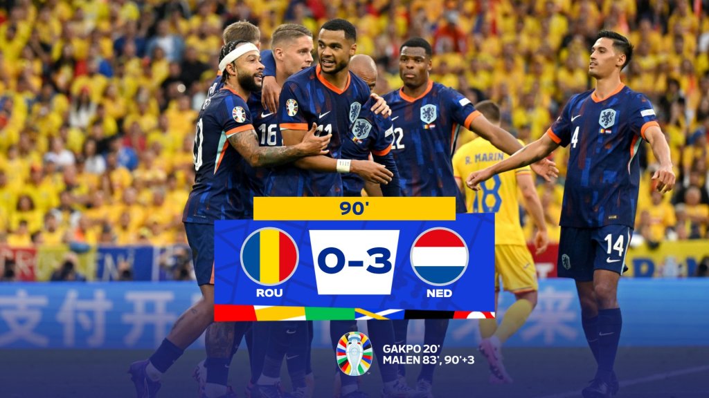 Η Ολλανδία κέρδισε τους Ρουμάνους με 3-0 και βρέθηκε στα προημιτελικά του Euro για πρώτη φορά μετά από το 2008. Ανώτεροι οι «οράνιε» στο μεγαλύτερο διάστημα του αγώνα, περιμένων πλέον αντίπαλο από το ζευγάρι Αυστρία-Τουρκία. Απόλυτος πρωταγωνιστής ο Κόντι Χάκπο με γκολ και ασίστ.