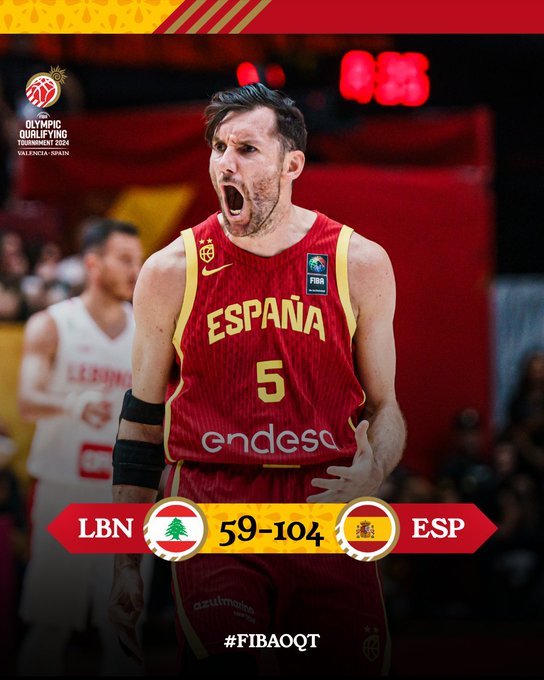 Η ομάδα του Σέρτζιο Σκαριόλο «σκόρπισε» τον Λίβανο στην πρεμιέρα του Προολυμπιακού Τουρνουά, που διεξάγεται στη Βαλένθια. Ωστόσο, οι ενοχλήσεις του Χουάντσο Ερνανγκόμεθ, που δεν αγωνίστηκε στο δεύτερο ημίχρονο της αναμέτρησης, προβληματίζουν τους «φούριας ρόχας». Για να έρθει η άνετη νίκη η Ισπανία πήρε πολλά από πολλούς. Συγκεκριμένα, ο Σάντι Αλντάμα είχε 17 πόντους και 9 ριμπάουντ, με τον Ουσμάν Γκαρούμπα να συμπληρώνει 15 πόντους και 8 ριμπάουντ.