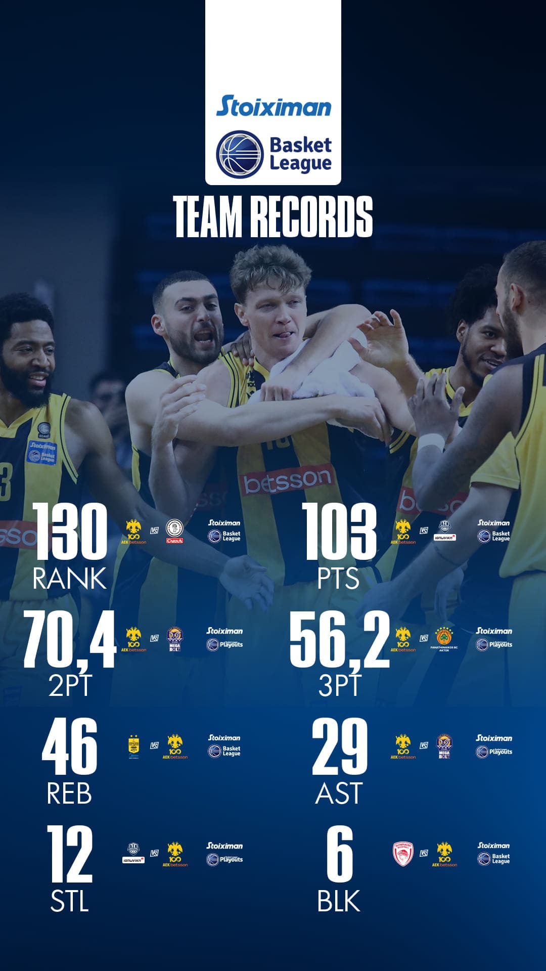 Σε εκείνο το παιχνίδι, η ΑΕΚ Betsson «έγραψε»: 14/18 βολές, 28/43 δίποντα, 10/23 τρίποντα, 33-12 ριμπάουντ, 23 ασίστ, 12 λάθη, 6 κλεψίματα, 4 κοψίματα κι ακόμη 19 πόντους από τα λάθη του αντιπάλου της, 52 πόντους μέσα από τη ρακέτα, 15 από επιθετικά ριμπάουντ και 31 από αιφνιδιασμούς –ρεκόρ της φετινής Stoiximan Basket League.