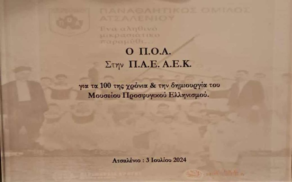 Η ΠΑΕ ΑΕΚ ήταν μεταξύ των τιμωμένων στην εκδήλωση πού έγινε στο Ηράκλειο Κρήτης με αφορμή την παρουσίαση του βιβλίου των 80 χρόνων ιστορίας του προσφυγικού σωματείου ΠΟ Ατσαλένιου. Αφορμή για τη βράβευση ήταν η συμπλήρωση ενός αιώνα ιστορίας για την ΑΕΚ, αλλά και η ίδρυση του Μουσείου Προσφυγικού Ελληνισμού στην OPAP ARENA.